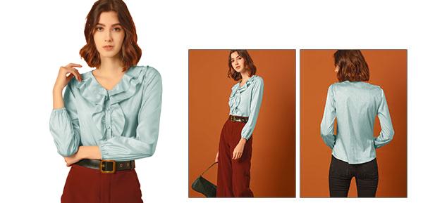 ソウテン Allegra K サテン フリルブラウス Vネック 光沢 ボタンアップシャツ パフスリーブ 長袖 レディース ミントグリーン S