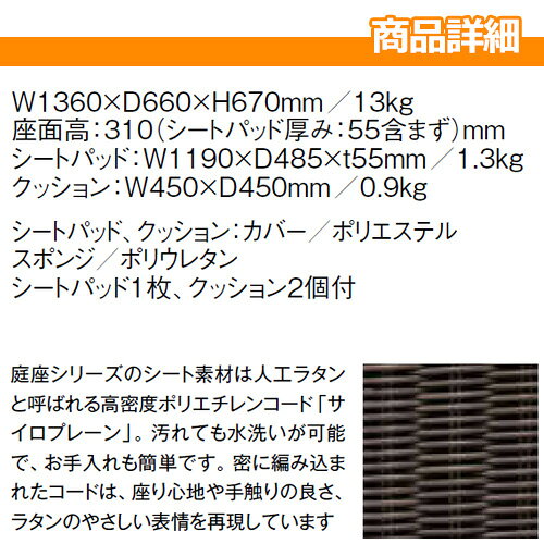 カラー ダークブラウン 仕様 ソファ/クッション付き 材質 人工ラタン/アルミ セット内容 ■庭座 ダブルソファ KFB-C009 34709400 備考・注意 ※配送には実働約5日〜10日程度お時間が必要となる場合があります。